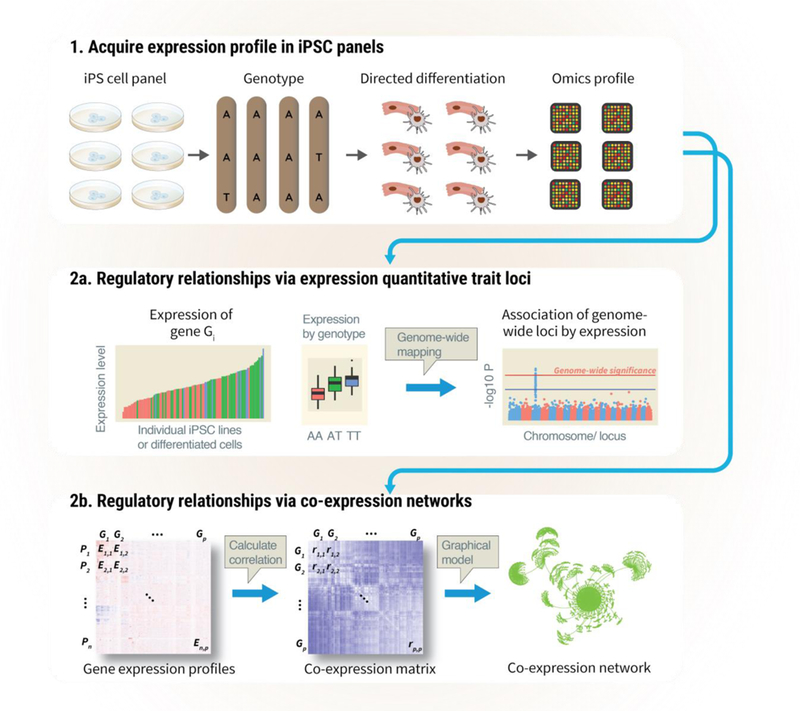 Human induced pluripotent stem cells (iPSCs) provide a renewable supply of patient-specific and tissue-specific cells for cellular and molecular studies of disease mechanisms. Combined with advances in various omics technologies, iPSC models can be used to profile the expression of genes, transcripts, proteins, and metabolites in relevant tissues. In the past 2 years, large panels of iPSC lines have been derived from hundreds of genetically heterogeneous individuals, further enabling genome-wide mapping to identify coexpression networks and elucidate gene regulatory networks. In a review article, we discussed the developments in omics profiling of various molecular phenotypes and the emergence of human iPSCs as a systems biology model of human diseases.