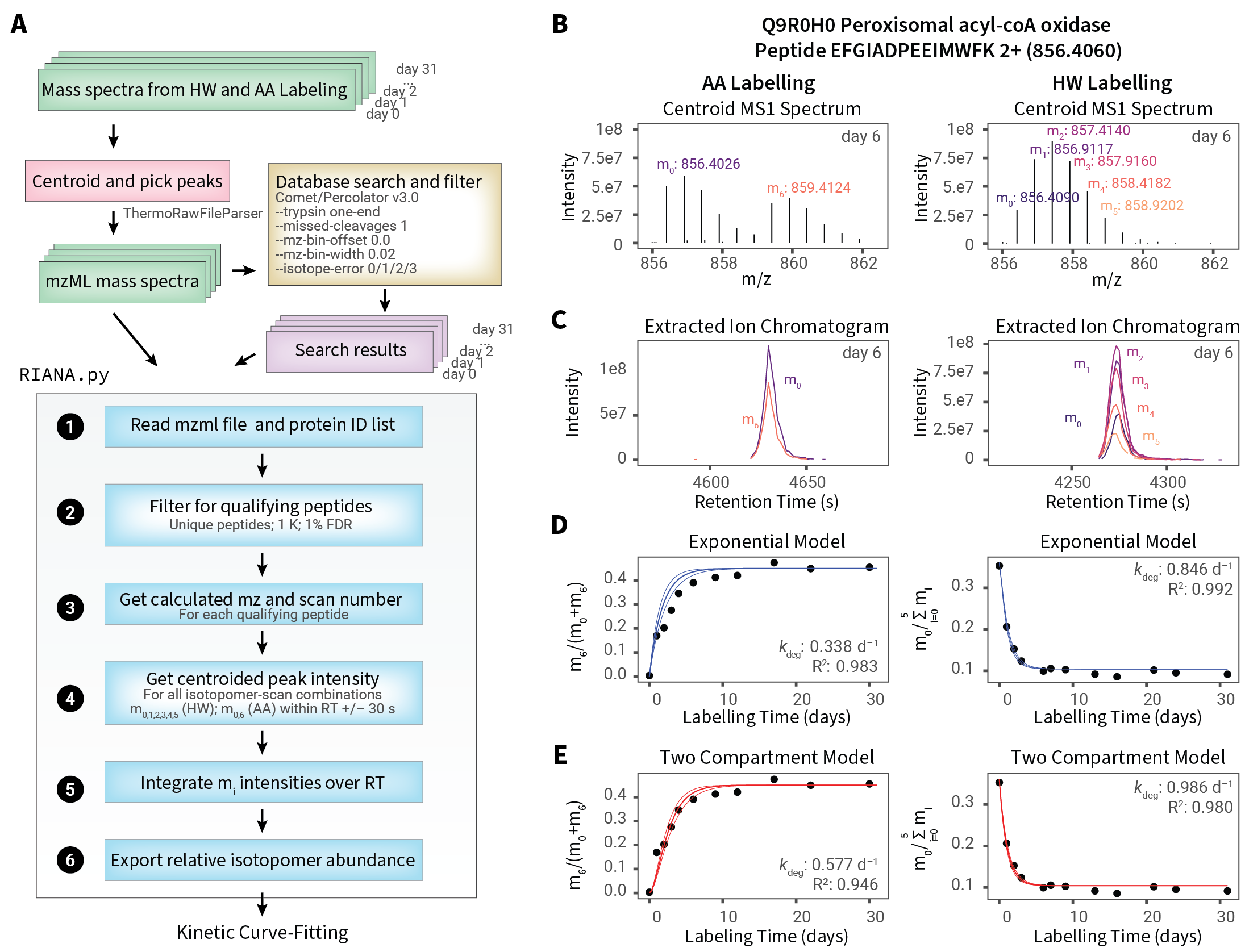 More recently, our team has collaborated with Dr. Rob Beynon's group at the University of Liverpool to perform a controlled comparison of heavy water vs amino acid labeling for measuring protein turnover rates across four different tissues (heart, liver, kidney, muscle) in the mouse. Amino acid labeling is commonly used as a metabolic protein precursor in animal models to measure in vivo protein turnover rate, but there are usually delays in how fast the labeled amino acid precursors become available for protein synthesis. This difference is likely dependent on the metabolism of the tissue too, and will delay the label incorporation into the measured protein, especially for proteins with very short half-life. We compared different kinetic models, and methods to derive the precursor kinetic parameters used to adjust half-life measurement, and compared the result to heavy water labeling which does not suffer from the same precursor delay problem. After some method refinement, we were able to show that both methods produced similar turnover rates. We provide some guidelines and best practice for correcting for precursor kinetics. We also describe an original Pythons software, Riana, which can be used to perform mass spectrometry data integration and kinetics curve fitting for both amino acid and heavy water studies. For details, please see our paper published in Molecular & Cellular Proteomics.